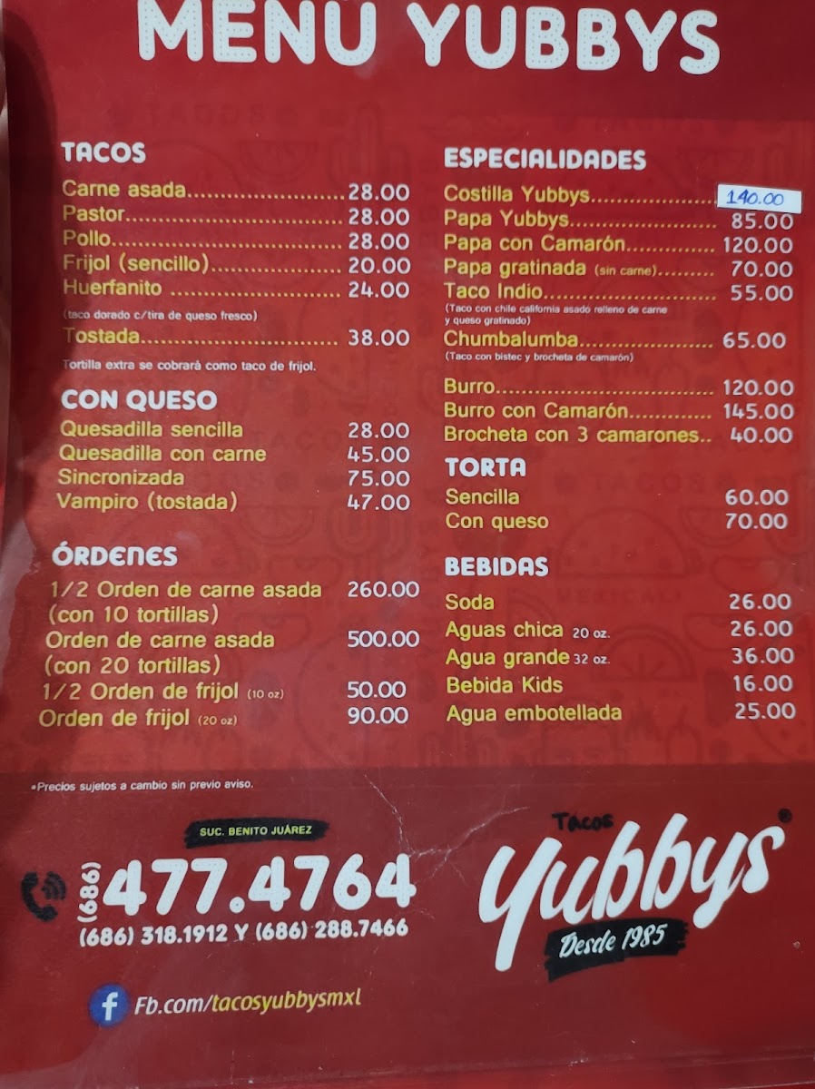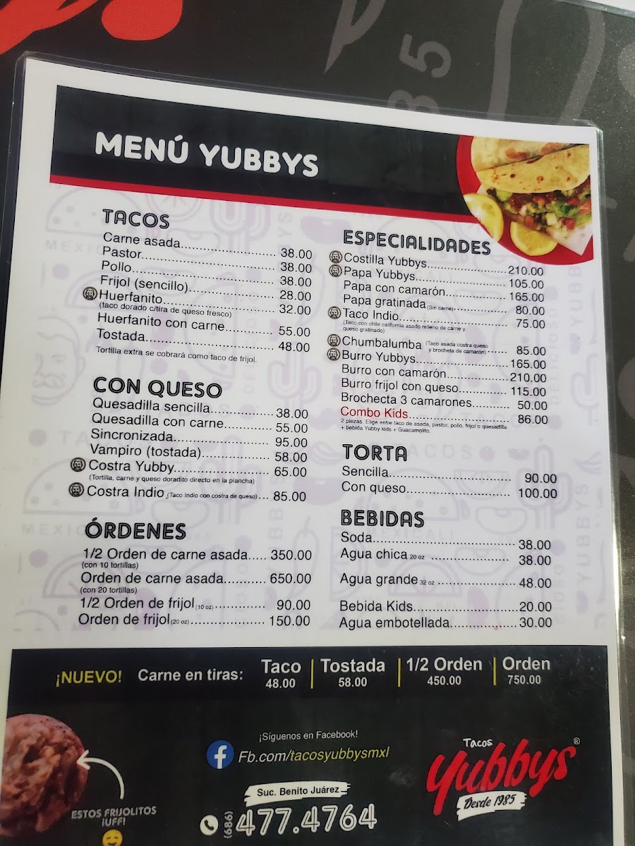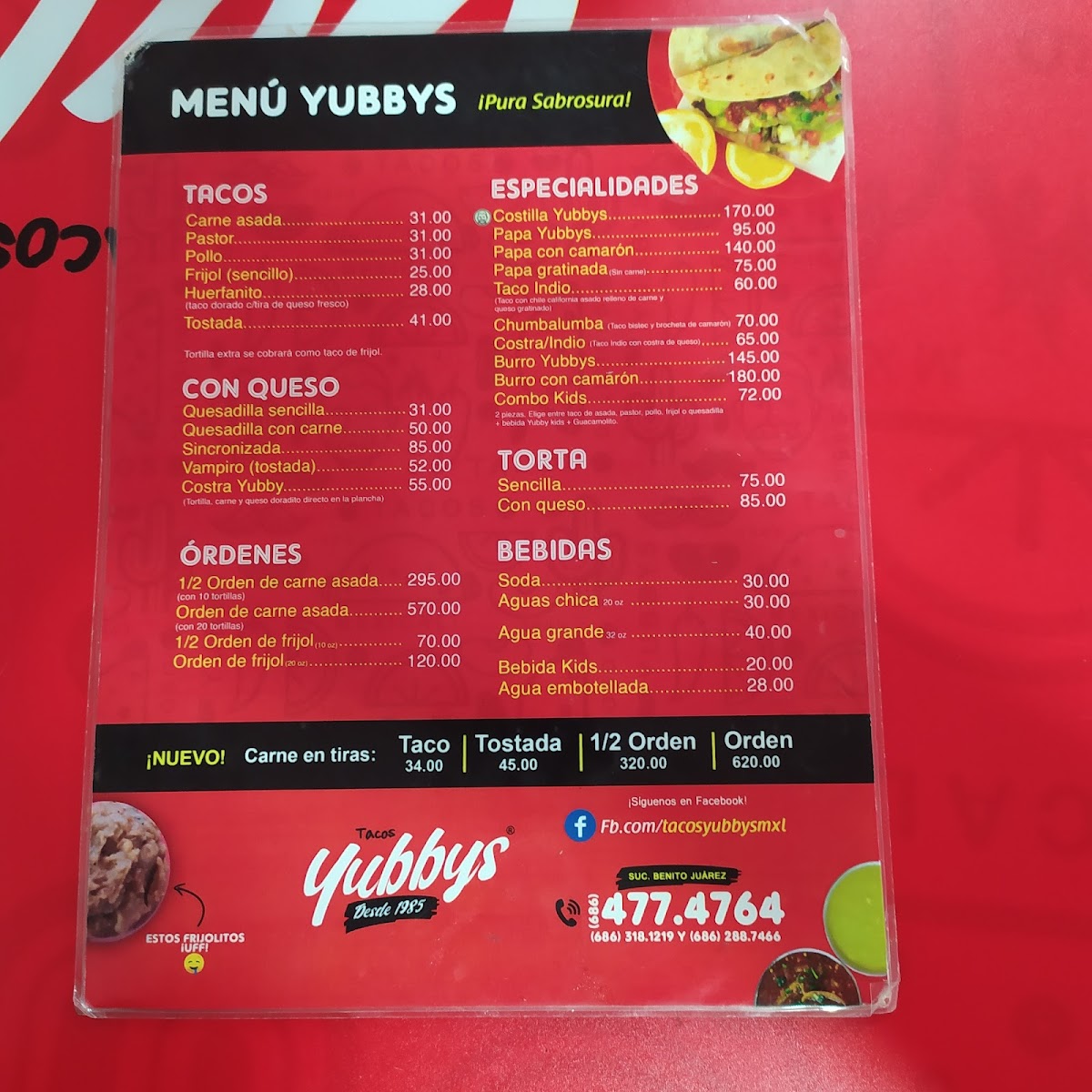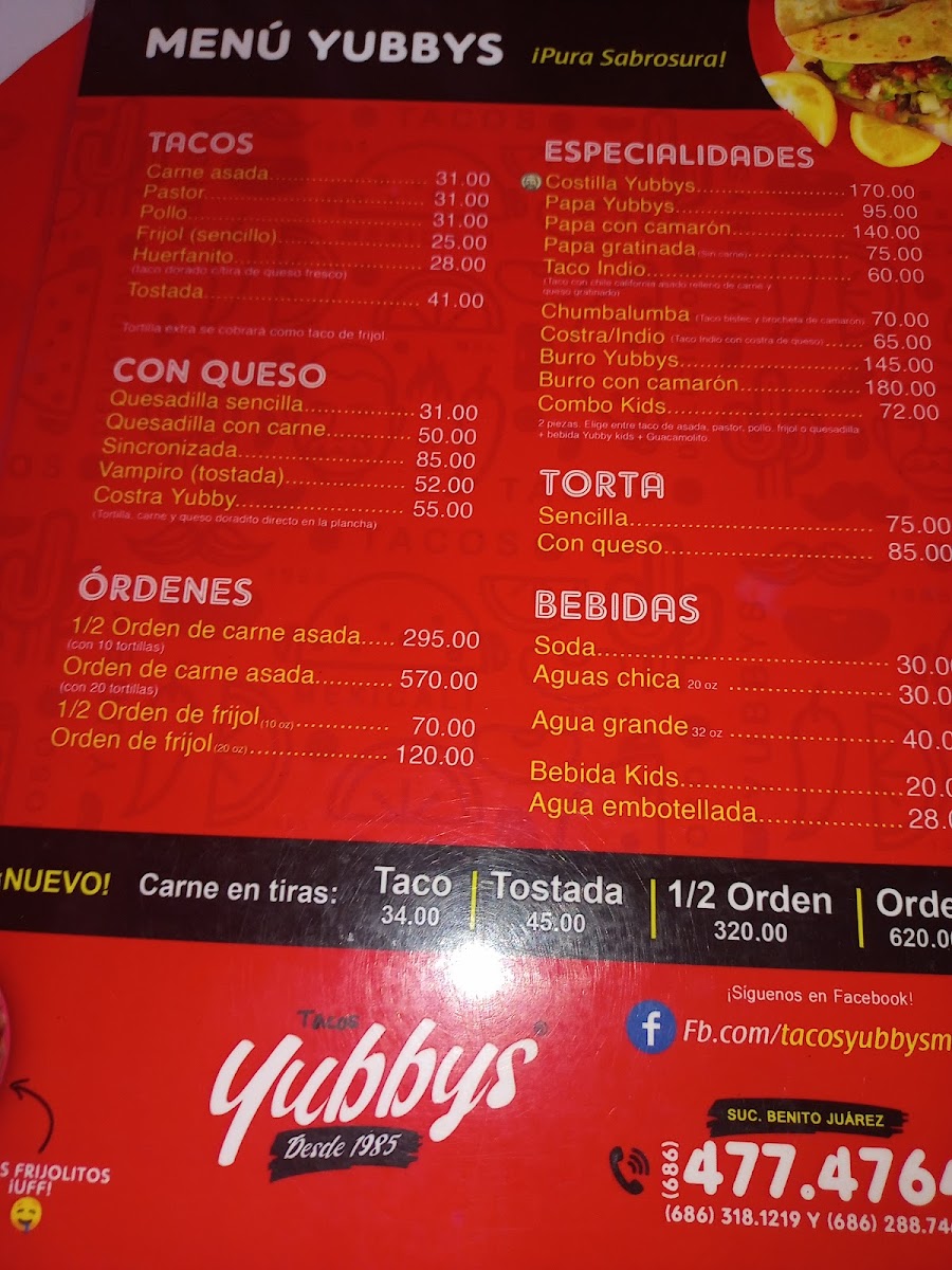 Welcome to Tacos Yubbys, a delightful taco haven nestled in Mexicali, B.C. This charming eatery offers a simple yet satisfying menu that highlights authentic Mexican flavors. Located at Blvd. Benito Juárez 4001, Tacos Yubbys is perfect for a quick bite on the go or a casual meal with friends. Customers rave about their fluffy flour tortillas, savory carne asada, and delicious stuffed potatoes topped with cheese and bacon, each dish delivering a salute to traditional Mexican cuisine.
