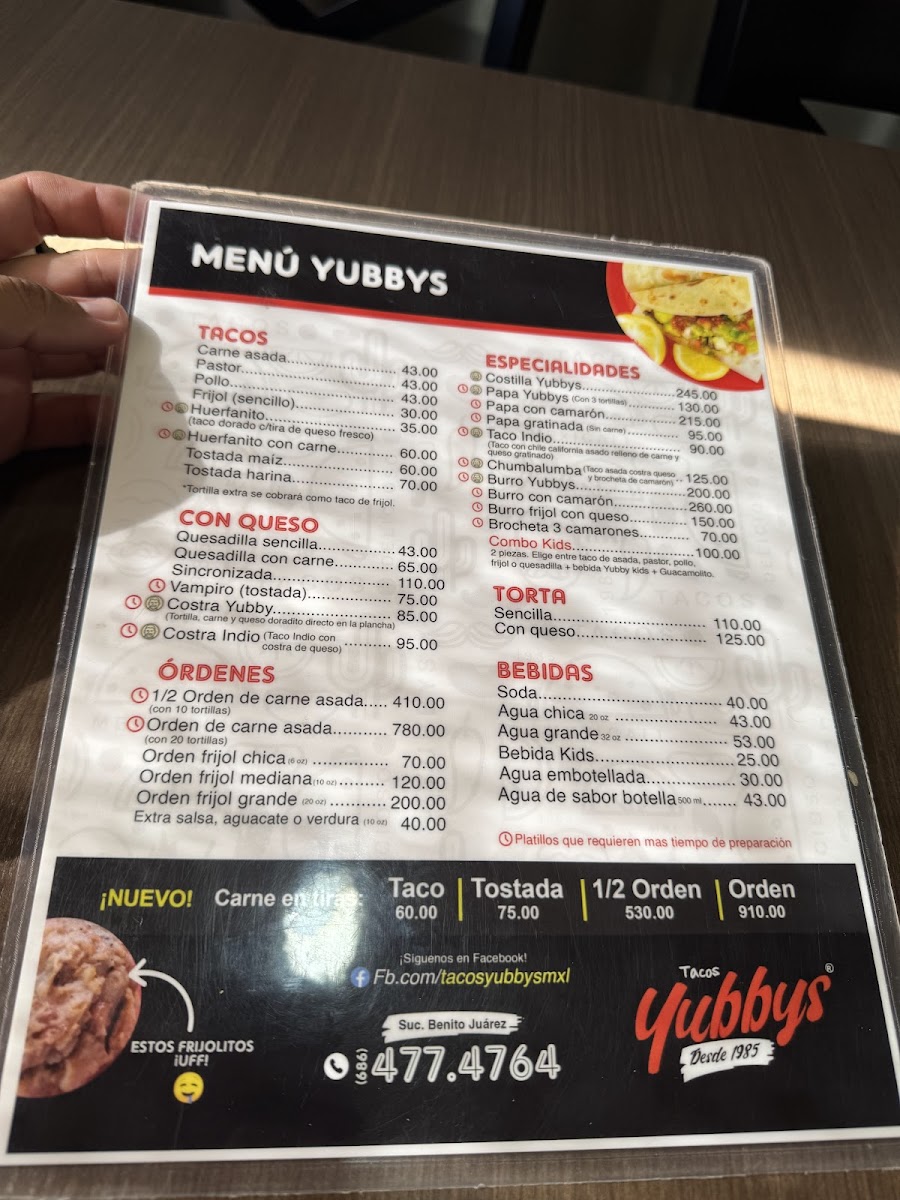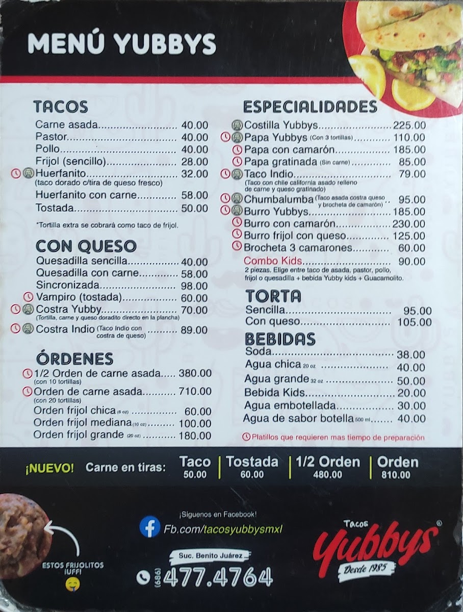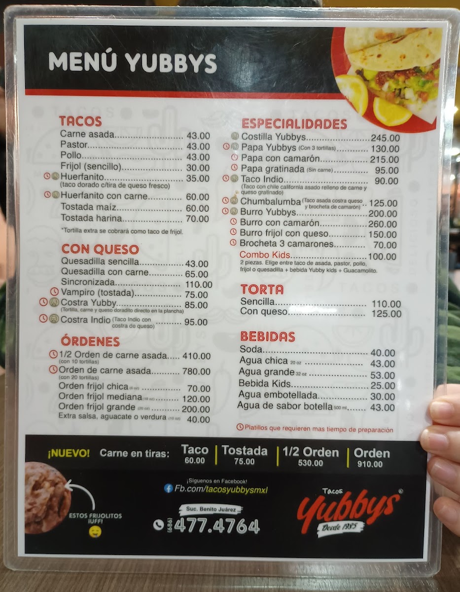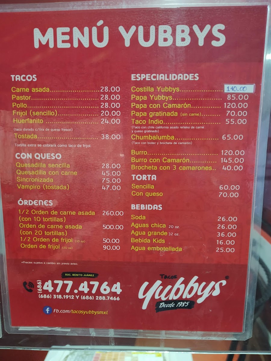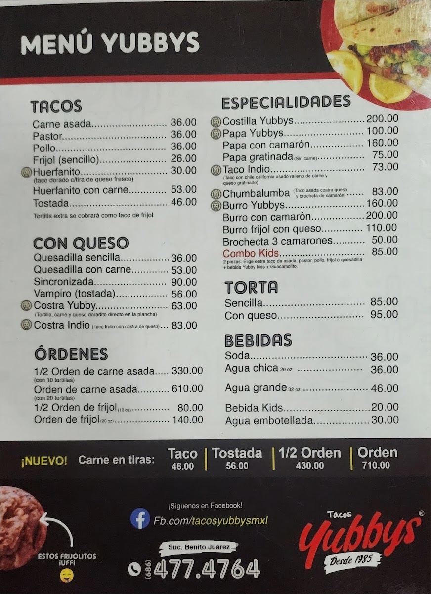 Welcome to Tacos Yubbys, a delightful taco haven nestled in Mexicali, B.C. This charming eatery offers a simple yet satisfying menu that highlights authentic Mexican flavors. Located at Blvd. Benito Juárez 4001, Tacos Yubbys is perfect for a quick bite on the go or a casual meal with friends. Customers rave about their fluffy flour tortillas, savory carne asada, and delicious stuffed potatoes topped with cheese and bacon, each dish delivering a salute to traditional Mexican cuisine.
